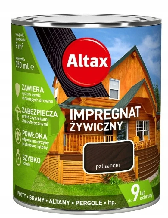 "description": "Dzięki nowoczesnej formule oraz zastosowaniu wysokogatunkowej żywicy, Impregnat Żywiczny odżywi Twoje drewno i zapewni mu długotrwałą odporność na czynniki atmosferyczne.Przeznaczenie: na zewnątrzRodzaj drewna: oszlifowane i nieoszlifowaneTrwałość: 9 lat ochronyDruga warstwa: już po 2hSposób aplikacji: pędzel syntetycznyWykończenie: matoweWydajność z 1L: 12m2 (jedna warstwa)Zalecana liczba warstw: 2Mycie narzędzi: wodaCzas schnięcia: odporny na deszcz po 1hZastosowanie:- Płoty- Altany- Meble ogrodowe- Pergole- Elewacje- Drzwi- Bramy- PodbitkiWłaściwości:- zawiera system żywic chroniących drewno- zabezpiecza przed czynnikami atmosferycznymi- powłoka odporna na grzyby pleśniowe i glony- szybko schnieDostępne pojemności: 750ml, 4,5L, 9LKolor:"