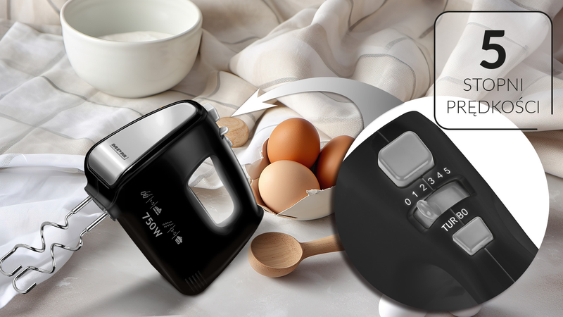 Poznaj elegancki, czarny mikser ręczny MMR-19C, o mocy 750W, który znacznie przyspiesza proces przygotowywania wielu dań. Mieszaj, wyrabiaj, ubijaj - dzięki wymiennym końcówkom, możesz dopasować rodzaj mieszadła do typu ciasta i eksperymentować z nowymi przepisami każdego dnia.