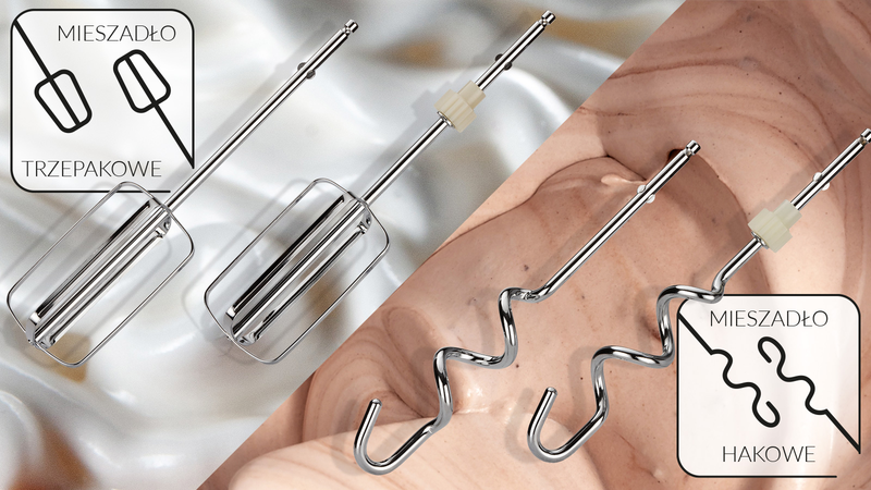 W zestawie z mikserem znajdziesz dwa mieszadła trzepakowe do ubijania piany i lekkich ciast oraz dwa mieszadła hakowe do wyrabiania cięższych ciast i mas mięsnych lub warzywnych.