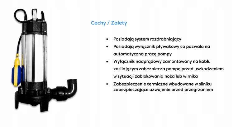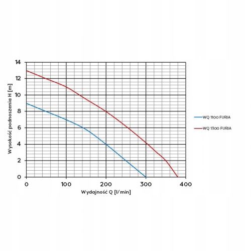 Pompa zatapialna WQ 1300 FURIA rozdrabniaczem to pompa dedykowana do ścieków, gnojowicy, wody z obecnością zanieczyszczeń organicznych i zanieczyszczeń bytowych. Pompa posiada system rozdrabniający który wstępnie tnie na kawałki pompowane medium dzięki czemu w rurociągu nie występuje efekt zapychania się odcinka tłocznego. Pompa posiada sterowanie pływakowe które steruje załączaniem się w zależności od poziomu pompowanego medium i chroni pompę przed pracą na sucho. WQ 1300 FURIA wyposażona jest w zabezpieczenie nadprądowe, na kablu zasilającym, chroniące silnik urządzenia przed przeciążeniem w przypadku zablokowania się wirnika np. patykiem. WQ 1300 FURIA z powodzeniem może być stosowana jako pompa do opróżniania zbiorników ściekowych, w gospodarstwach wiejskich i domowych