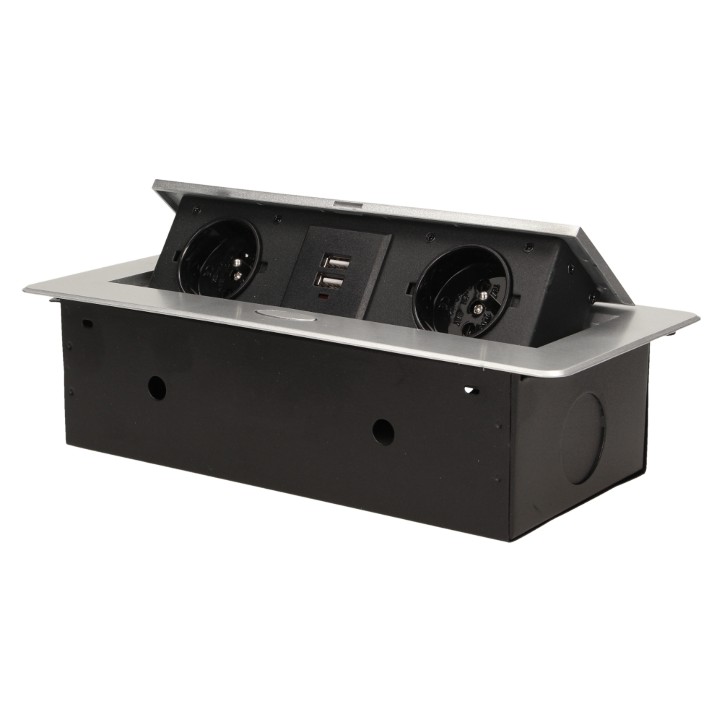 Zestaw dwóch gniazd sieciowych z uziemieniem i przesłonami torów prądowych, połączonych z ładowarką USB w obudowie chowanej w blat. Urządzenie przeznaczone jest do montażu w biurkach, blatach i stołach, może być zamontowane zarówno w pozycji pionowej jak i poziomej zapewniając dostęp do gniazd elektrycznych. Zalecany przewód OWY 3 × 1,5 mm (brak w zestawie).