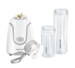 Pojemnik do mieszania można wyjąć i użyć jako pojemnik podróżny. Wydajną pracę gwarantuje silnik 500 W, przełącznik impulsowy i wysokiej jakości noże wykonane z 4 stali nierdzewnej. Opakowanie zawiera butelkę niezawierającą BPA, wykonaną z 0,6 li 0,3 l Tritanu. Trwałe, mocne butelki nadają się do każdej aktywności. Możesz go zabrać ze sobą na bagażnik rowerowy lub użyć podczas jazdy w samochodzie. Szklanki, pokrywki i noże można również myć w zmywarce.