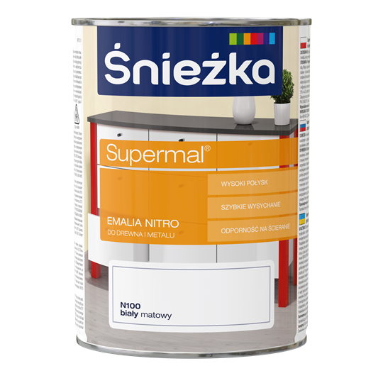 SUPERMAL- Emalia nitro przeznaczona jest do profesjonalnego malowania galanterii wykonanej z drewna, materiałów drewnopochodnych i metalu. Może być również używana w instalacjach do przemysłowego malowania elementów drewnianych, drewnopochodnych oraz metalowych. Wymalowanie nie jest odporne na działanie zmiennych warunków atmosferycznych.