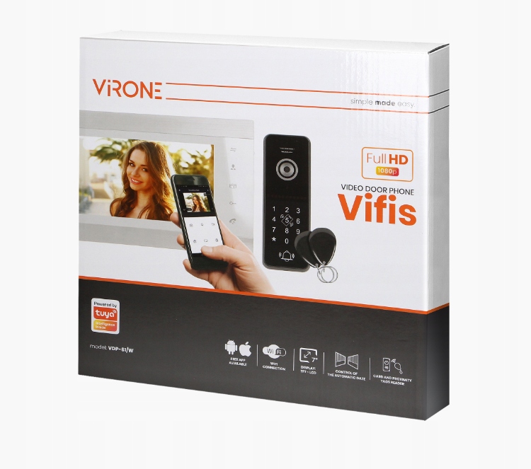 Nowoczesny zestaw wideo domofonowy VIFIS Full HD składający się z kolorowego ultra płaskiego monitora LCD 7" gwarantującego obraz doskonałej jakości, oraz zewnętrznej kasety z kamerą Full HD 1080P. Komunikacja między panelem wewnętrznym i zewnętrznym nie wymaga słuchawki. Po pobraniu darmowej aplikacji TUYA, użytkownik ma możliwość sterowania urządzeniem ze swojego smartfonu. Dodatkowe oświetlenie kasety diodami IR umożliwia widzenie nocą, a wbudowany szyfrator i czytnik RFID umożliwia dostęp za pomocą kodu lub kart i breloków zbliżeniowych (MIFARE). Zestaw posiada funkcję intercomu, nagrywania filmów i obrazów, sterowania bramą oraz otwierania elektrozaczepu. Możliwość rozbudowy o dodatkowe elementy z serii VIFIS Full HD.